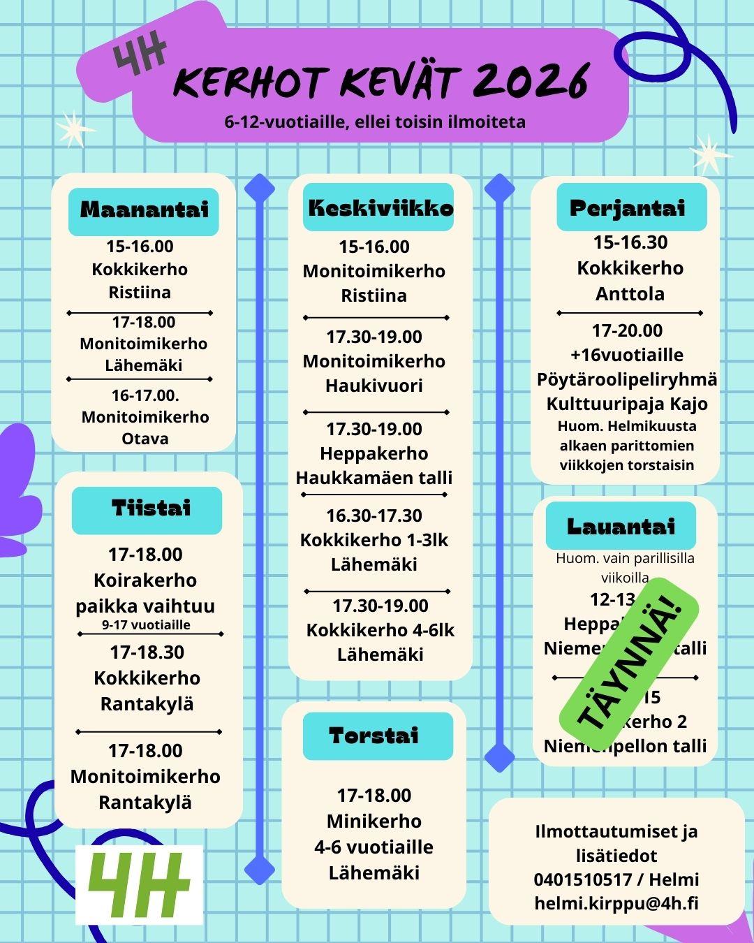 Kevään kerhokausi alkaa viikolla 3 (12.1.2026 alkaen).