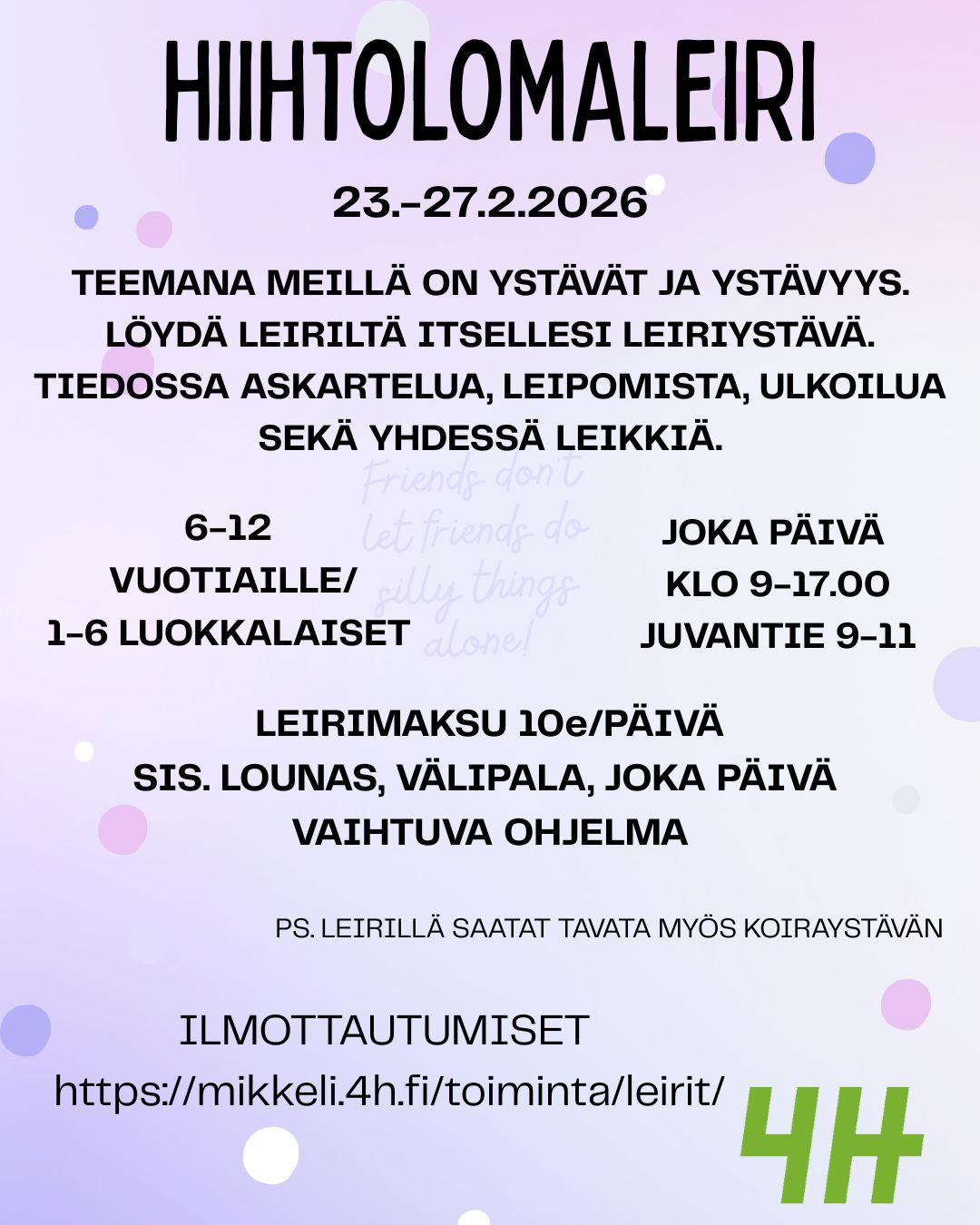 Ilmoittaudu nyt mukaan 4H-hiihtolomaleirille! Leiri pidetään 24.-28.2.2025 4H:n toimitiloissa (Juvantie 9-11, 50170 Mikkeli). Leiripäivät ovat joka arkipäivä klo 9-17.00. Hiihtolomaleiri pidetään…